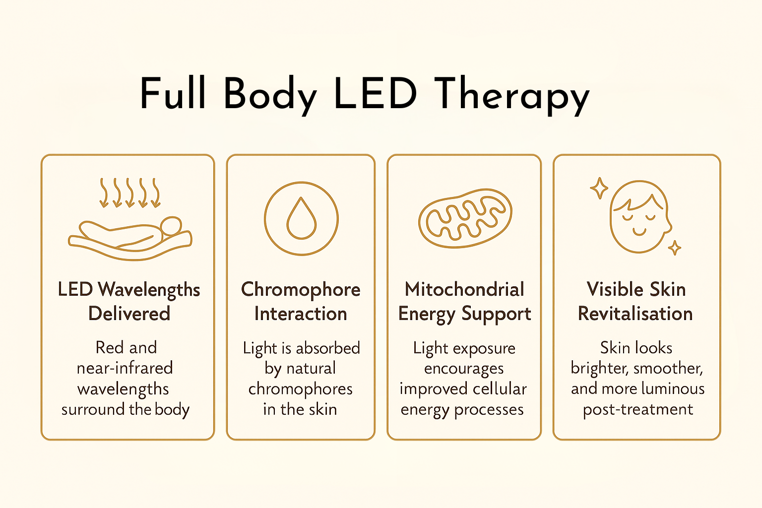 Full Body LED Therapy is based on the principles of photobiomodulation, where specific wavelengths of light interact with the skin to support its natural energy processes. As gentle, UV-free LED light reaches the surface layers, it is absorbed by structures within the cells — particularly those involved in energy and rejuvenation.