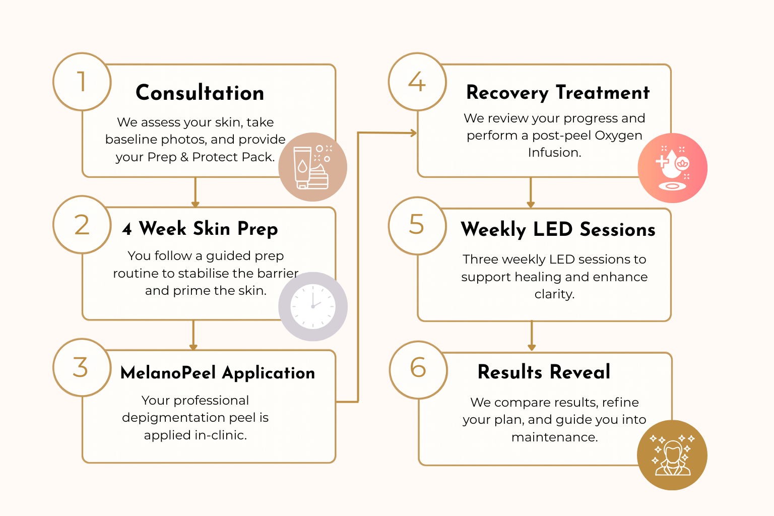 1. Consultation & Skin Analysis - A thorough assessment, photos, and personalised planning. You receive your Prep & Protect Pack and begin your guided homecare.