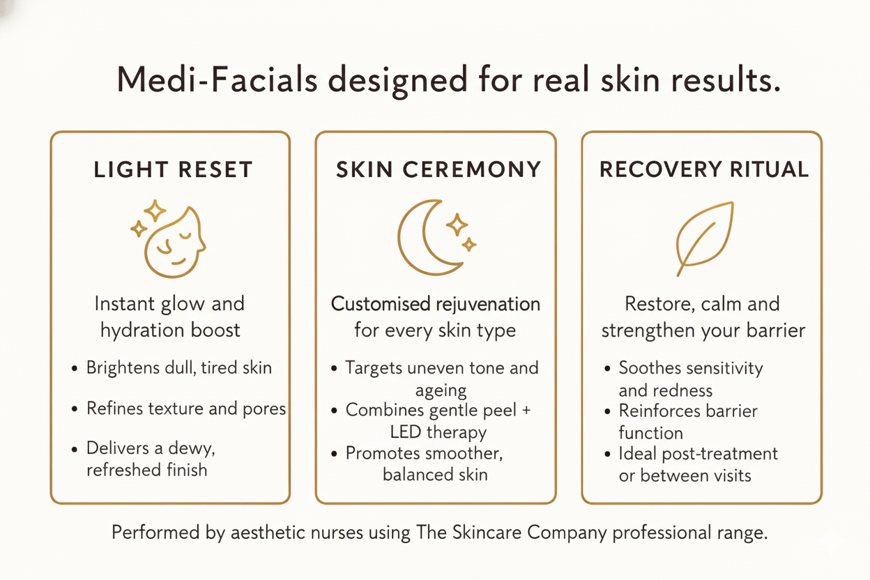 Absolutely. Medi-Facials complement most advanced skin procedures, including LED therapy, microneedling, and chemical peels. Your clinician can help you design a customised treatment plan that enhances your outcomes and supports recovery.